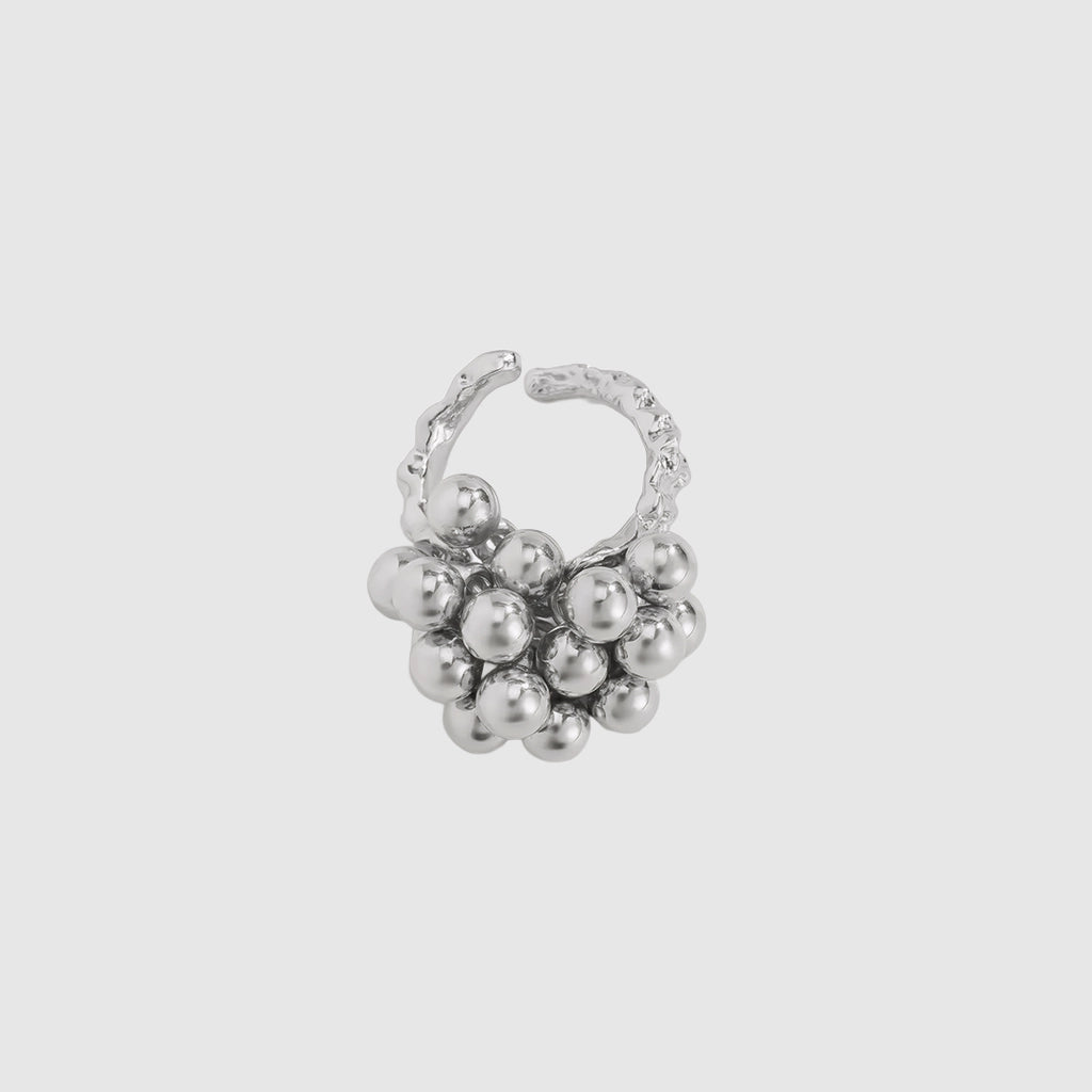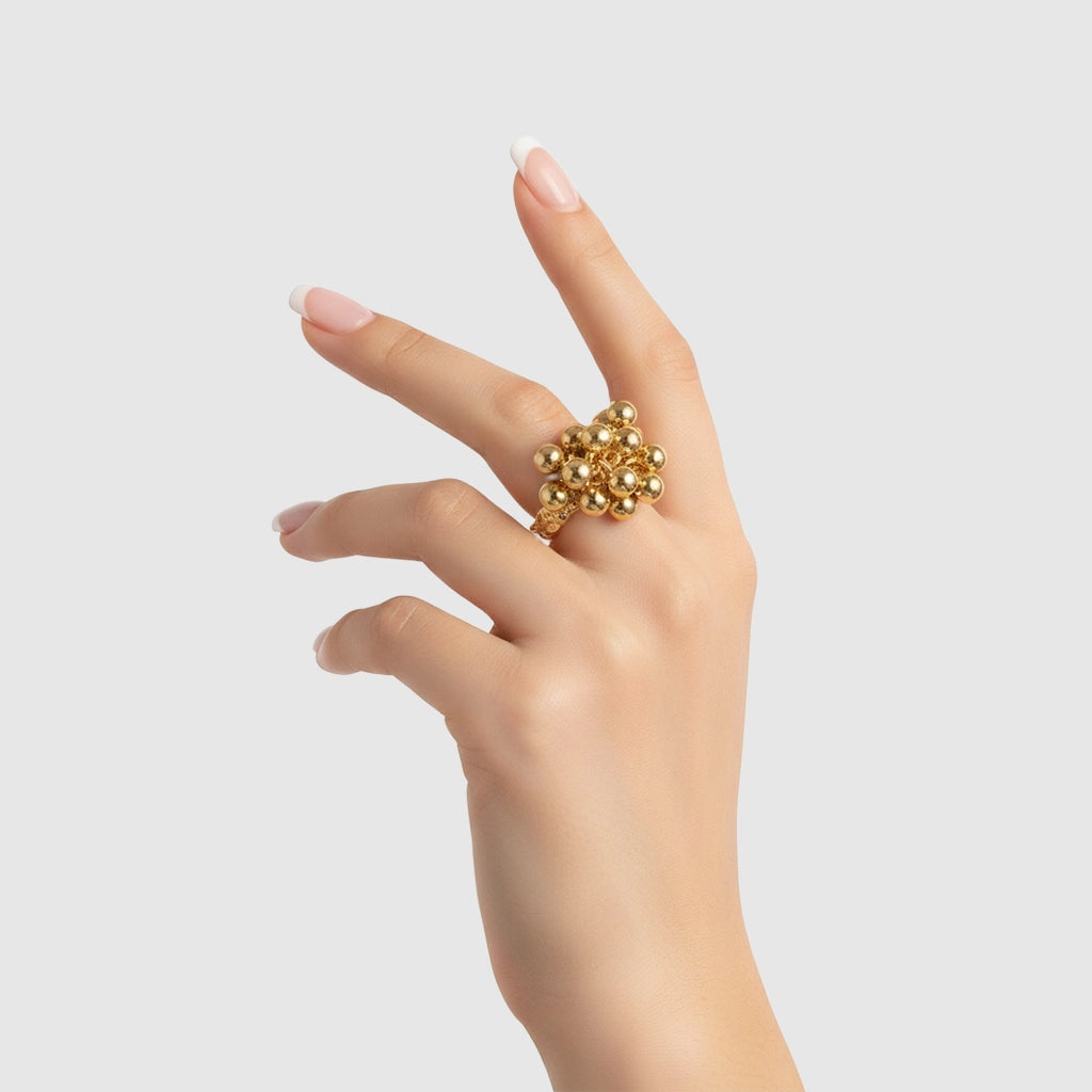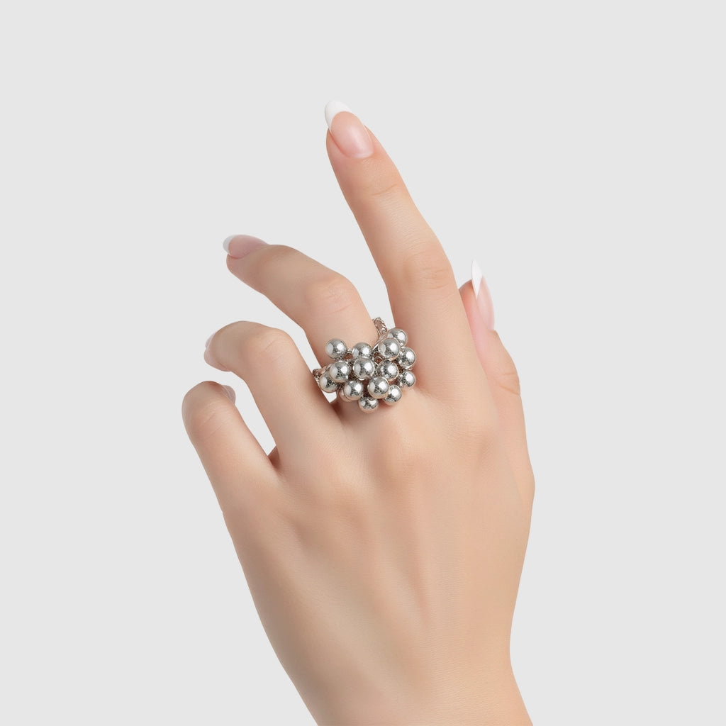 Kirelia е хаос, превърнат в красота – съзвездие от сфери, сблъскващи се в един ослепителен дизайн. Всяка метална топка улавя светлината по различен начин, правейки пръстена жив с движение и енергия. Не е деликатен – това е смела история, разказана на ръката ти.
