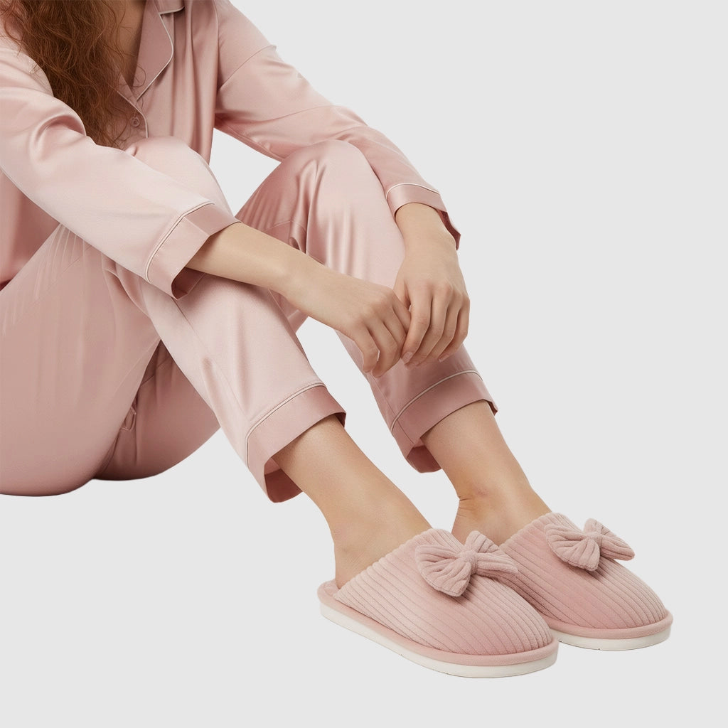 Plinuki ass Séissheet, déi een unzéie kann. Mat senger mëller Corduroy-Textur, flauscheger Fütterung an engem verspillte Schleefdetail mécht et all Schrëtt bannen waarm a charmant. Vun Pyjama-Mueresstonnen bis gemittlech Nuechten doheem ass Plinuki de Chalisa Wee, stilvoll, bequem a liicht dreemeg doheem ze bleiwen.