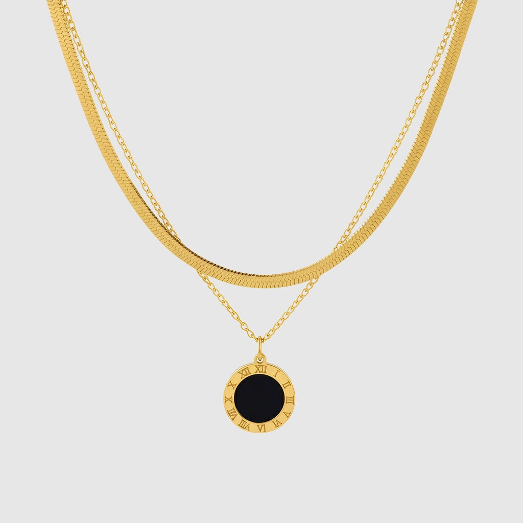 Urissa is meer dan een accessoire – het is een symbool van eeuwigheid. Romeinse cijfers omringen de hanger en omlijsten een diep zwart midden dat zowel mysterieus als modern aanvoelt. Een ketting die tijdloosheid fluistert terwijl hij gedurfde elegantie uitstraalt.