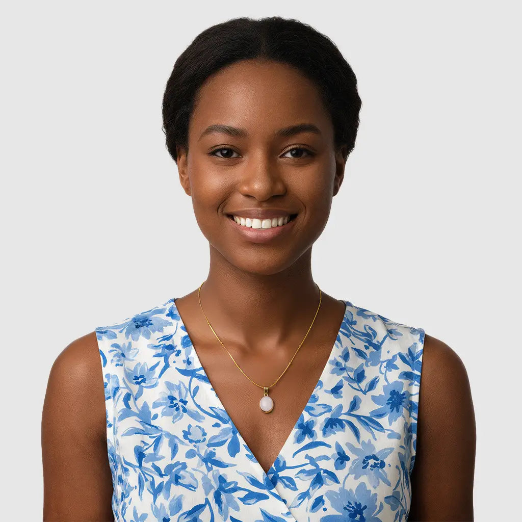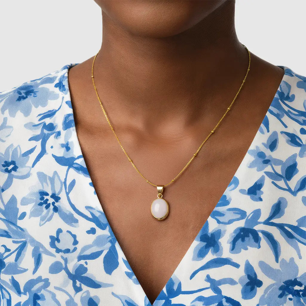 There’s beauty in simplicity – Aracleo proves that less truly is more. The smooth oval pendant, framed in gold, glows softly with its pastel shades, creating a look that feels both modern and timeless. It’s a piece that tells the story of elegance in restraint – the kind of jewelry that whispers, never shouts.