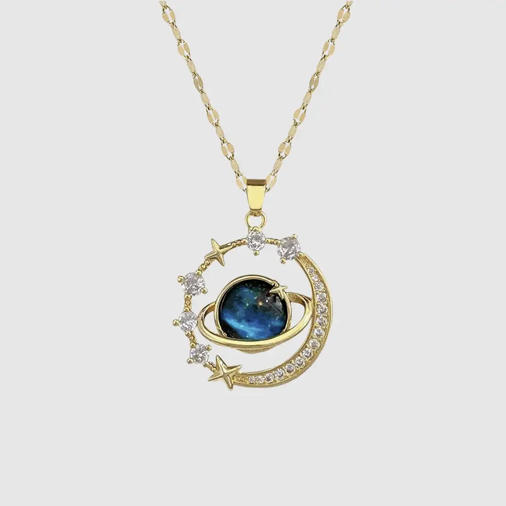 Araio is inspired by the mystery of the night sky – a universe captured in a pendant. The glowing blue planet set against a golden crescent moon tells a story of infinity, dreams, and endless possibilities. A necklace not just to wear, but to believe in.