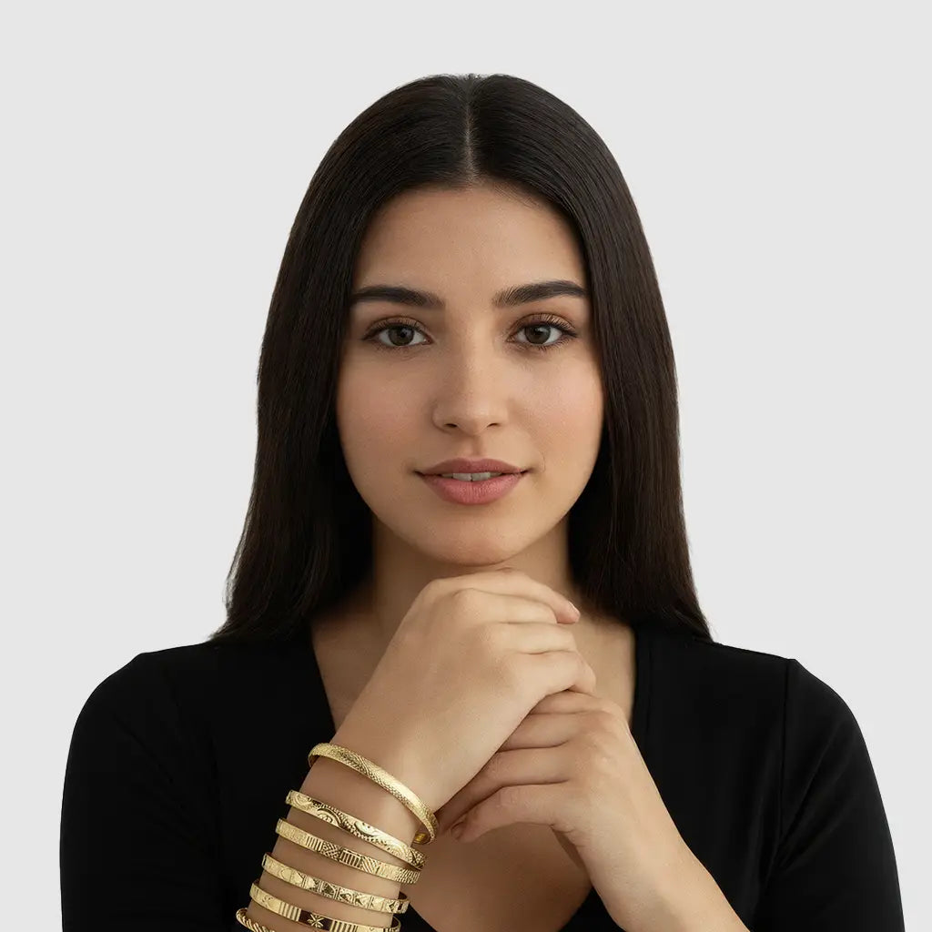 Avalaor isn’t just jewelry – it’s attitude multiplied by seven. Each bangle tells its own story: some sleek, some carved, some twisted. Together, they create a layered statement that feels bold, rebellious, and irresistibly golden.