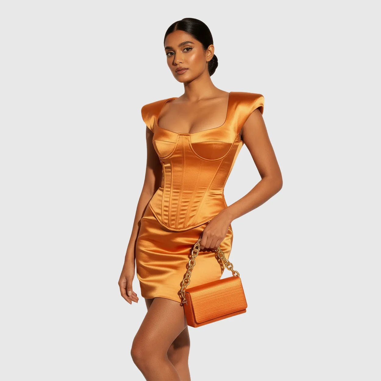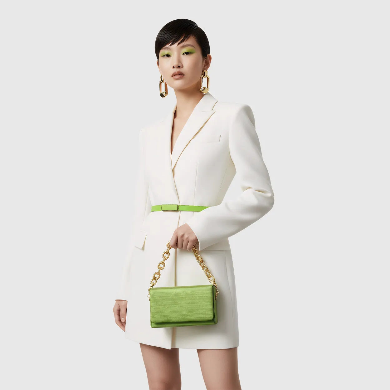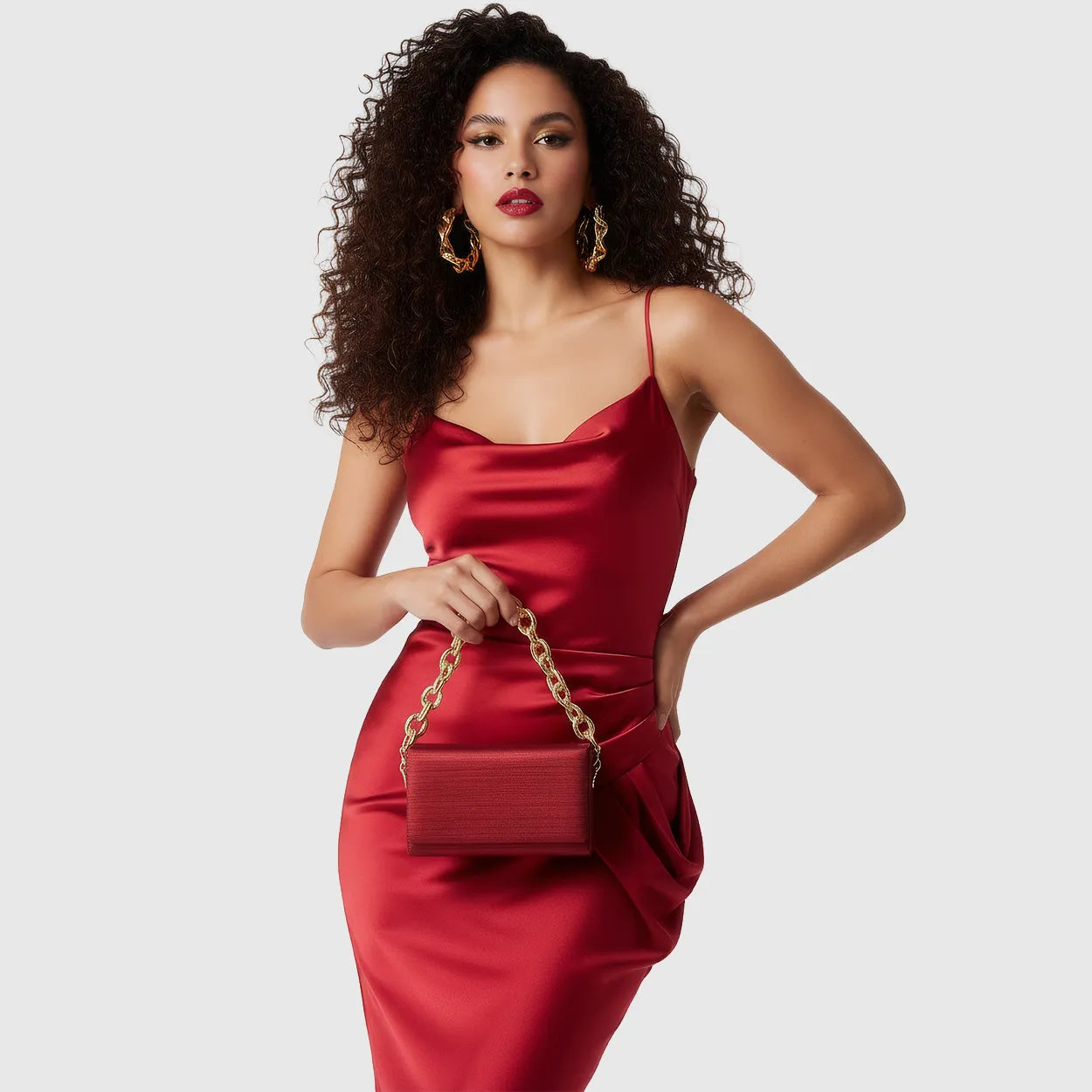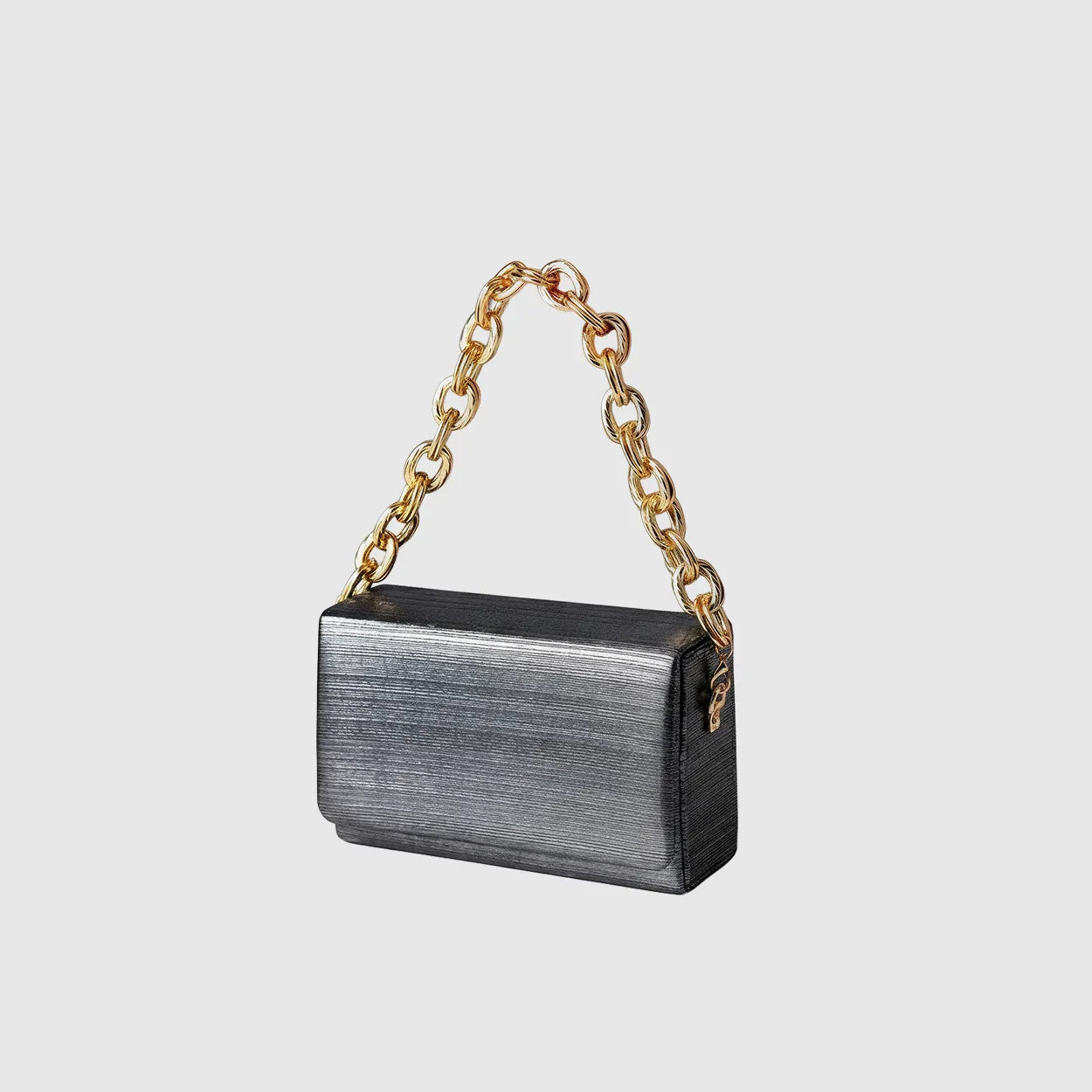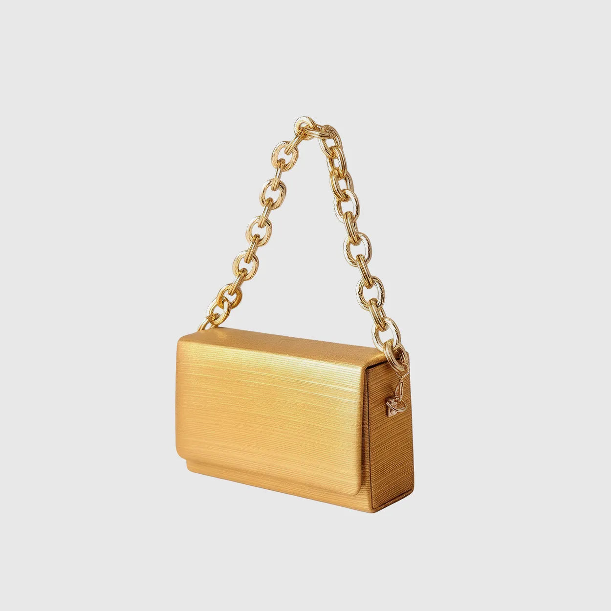 Where luxury meets allure. This structured PU leather clutch with a bold gold chain handle shines with refined elegance for weddings and soirées.