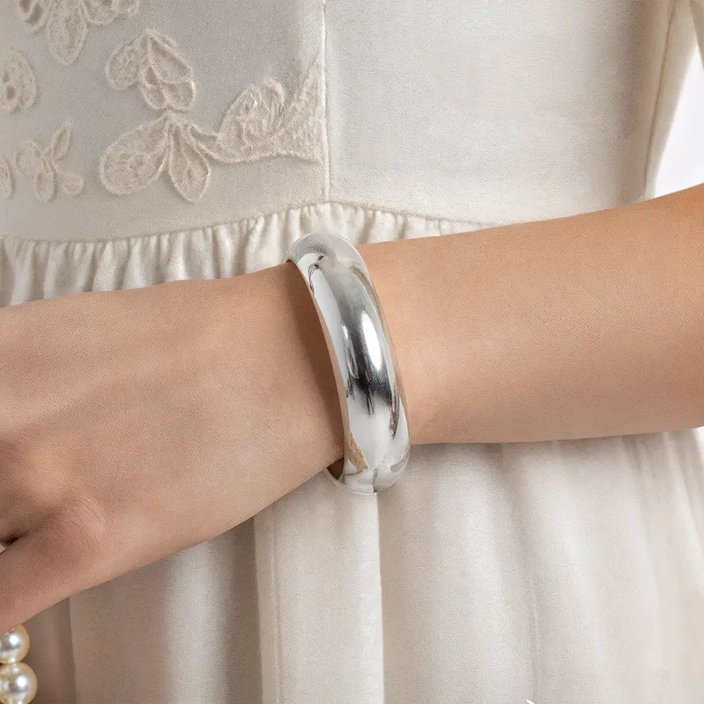 Elonora is rebellion captured in metal – sleek, geometric, and unapologetically bold. Its retro-inspired curves and metallic edge recall underground nights and fearless self-expression, turning a simple cuff into wearable punk poetry.