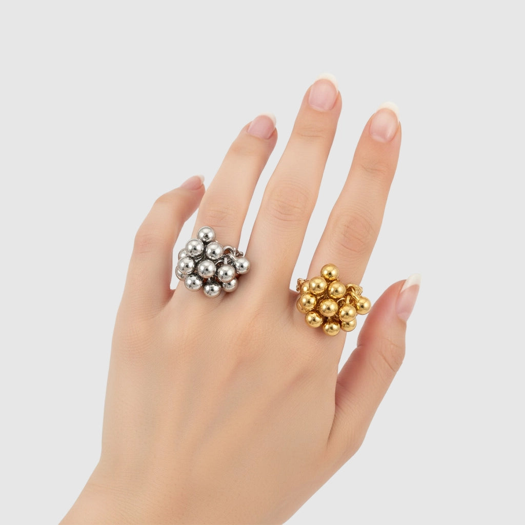 Kirelia is chaos turned into beauty – a constellation of spheres colliding into one dazzling design. Each metallic ball catches the light differently, making the ring alive with movement and energy. It’s not subtle – it’s a bold story told on your hand.