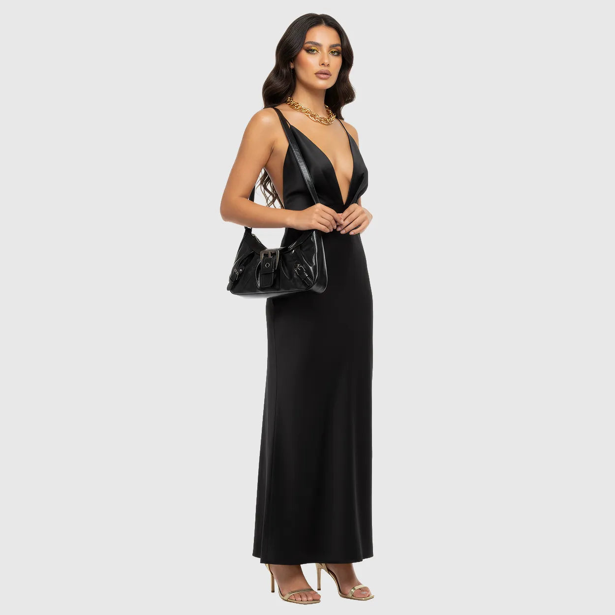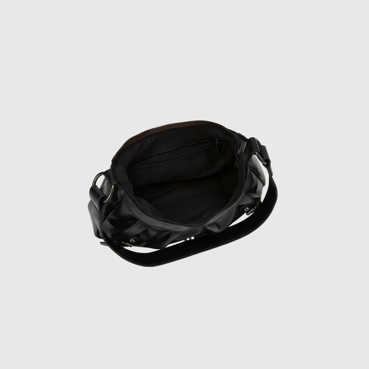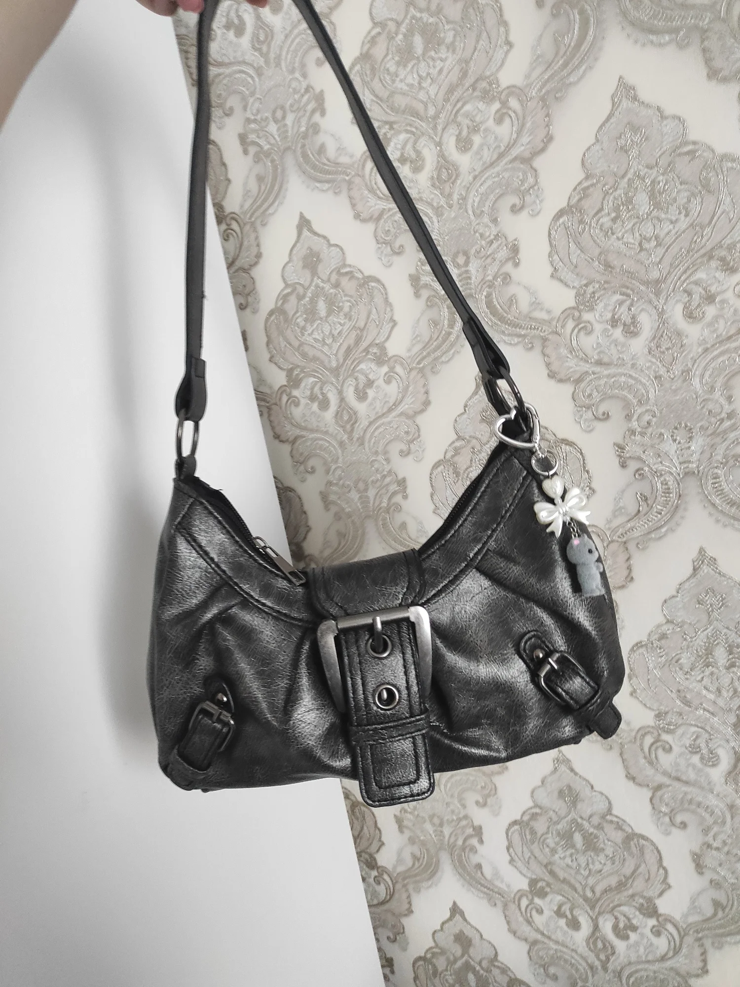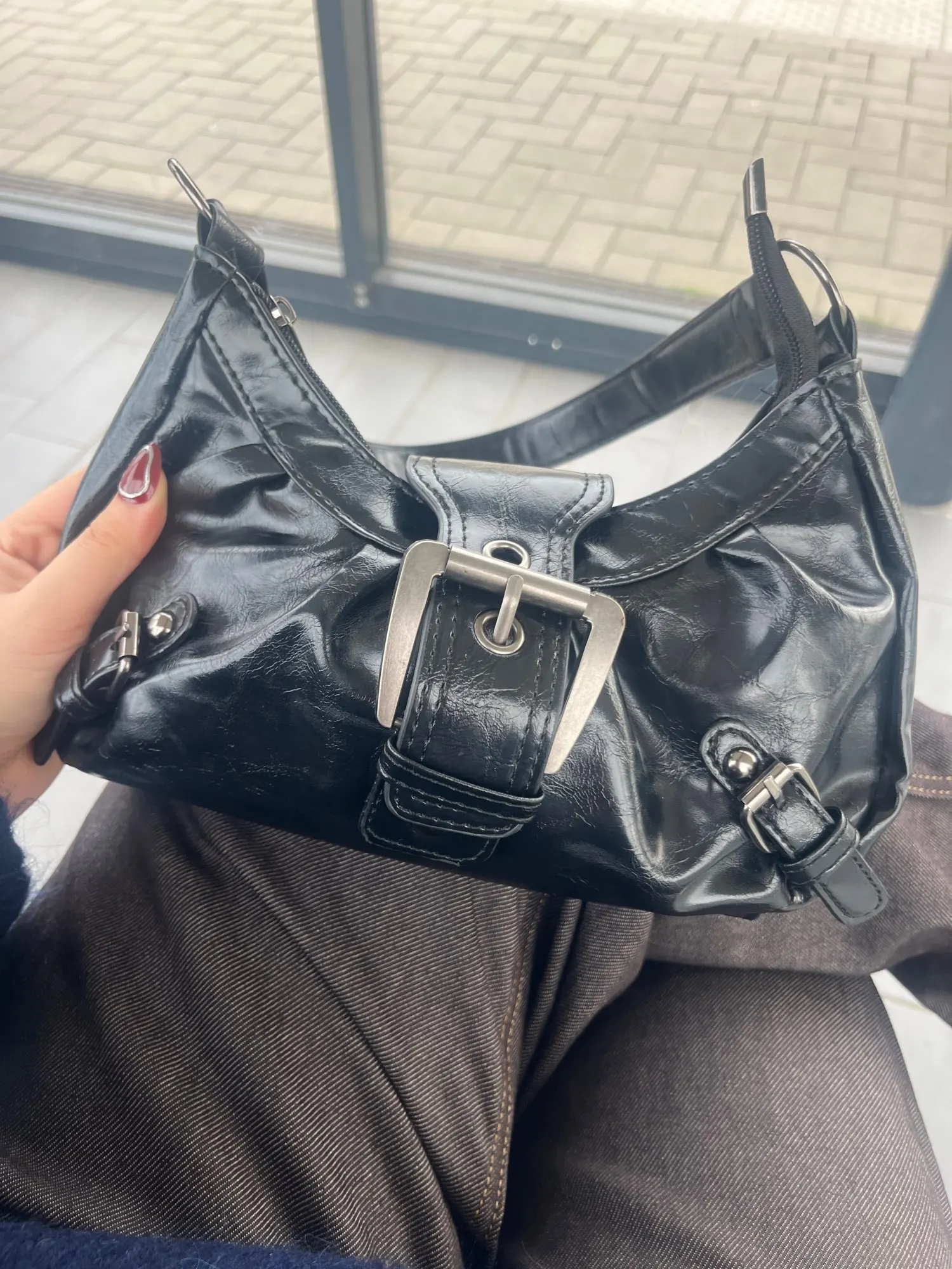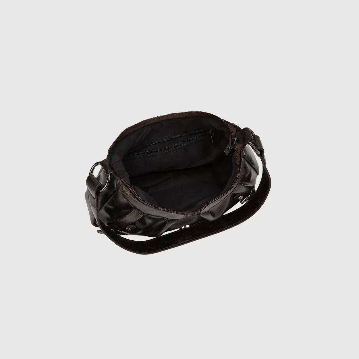 Unapologetically bold. This Y2K-inspired half-moon bag brings back moto chic with pleats, rivets, and glossy PU flair for every street moment.