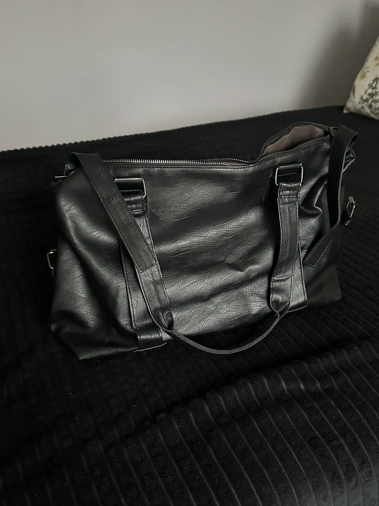 My new favorite bag. It's darker than it looks in the photos but the material is super soft and pleasant, also super malleable, so it can be folded and adapts to bulky contents. It's noticeable that it's artificial leather and only time will tell if it's good or not, but it has a lot of capacity, plenty of pockets, and a long strap to carry it crossbody.