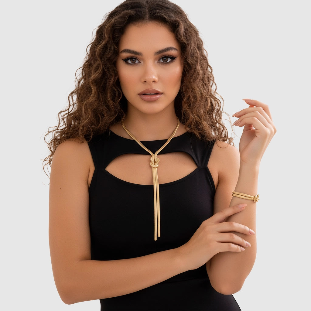 Seriva is your go-to set for statement looks – from rooftop parties to elegant dinners. Wear necklace and bracelet together for full drama, or style them separately for subtle chic. Pair with a black slip dress for maximum allure, or with a crisp blazer for fashion-forward minimalism.