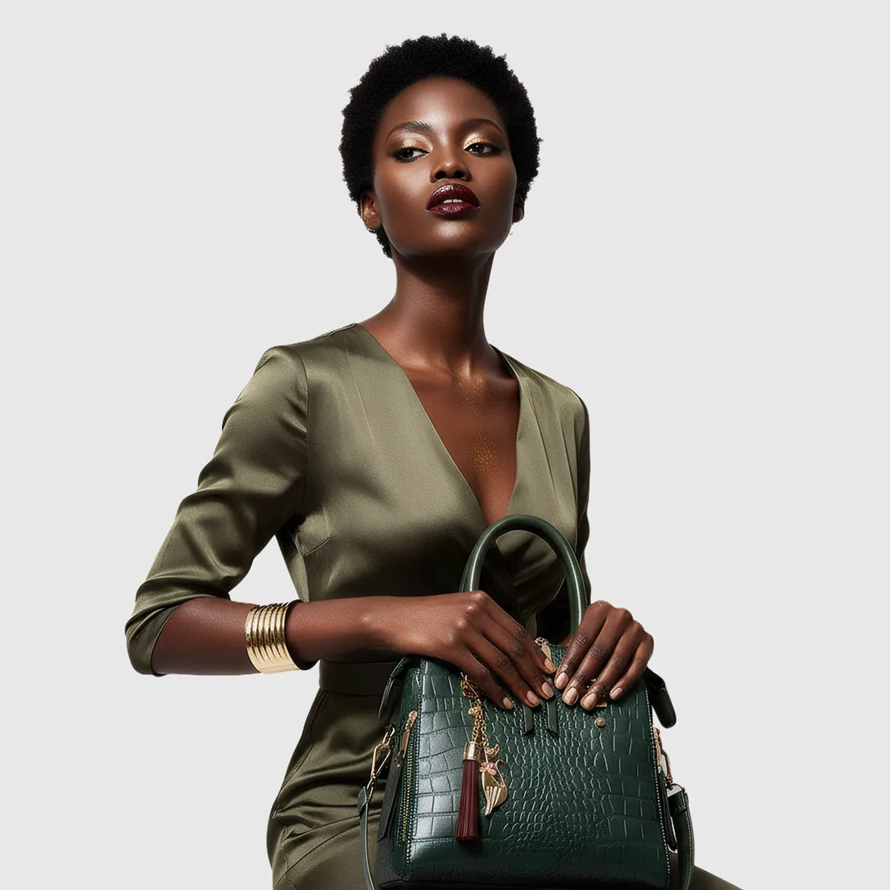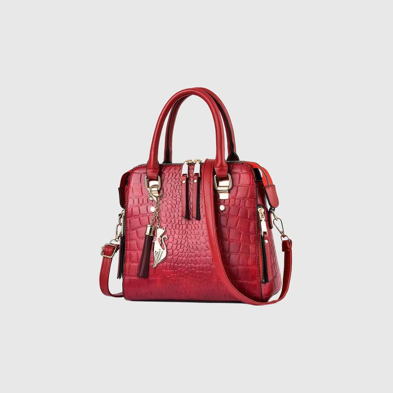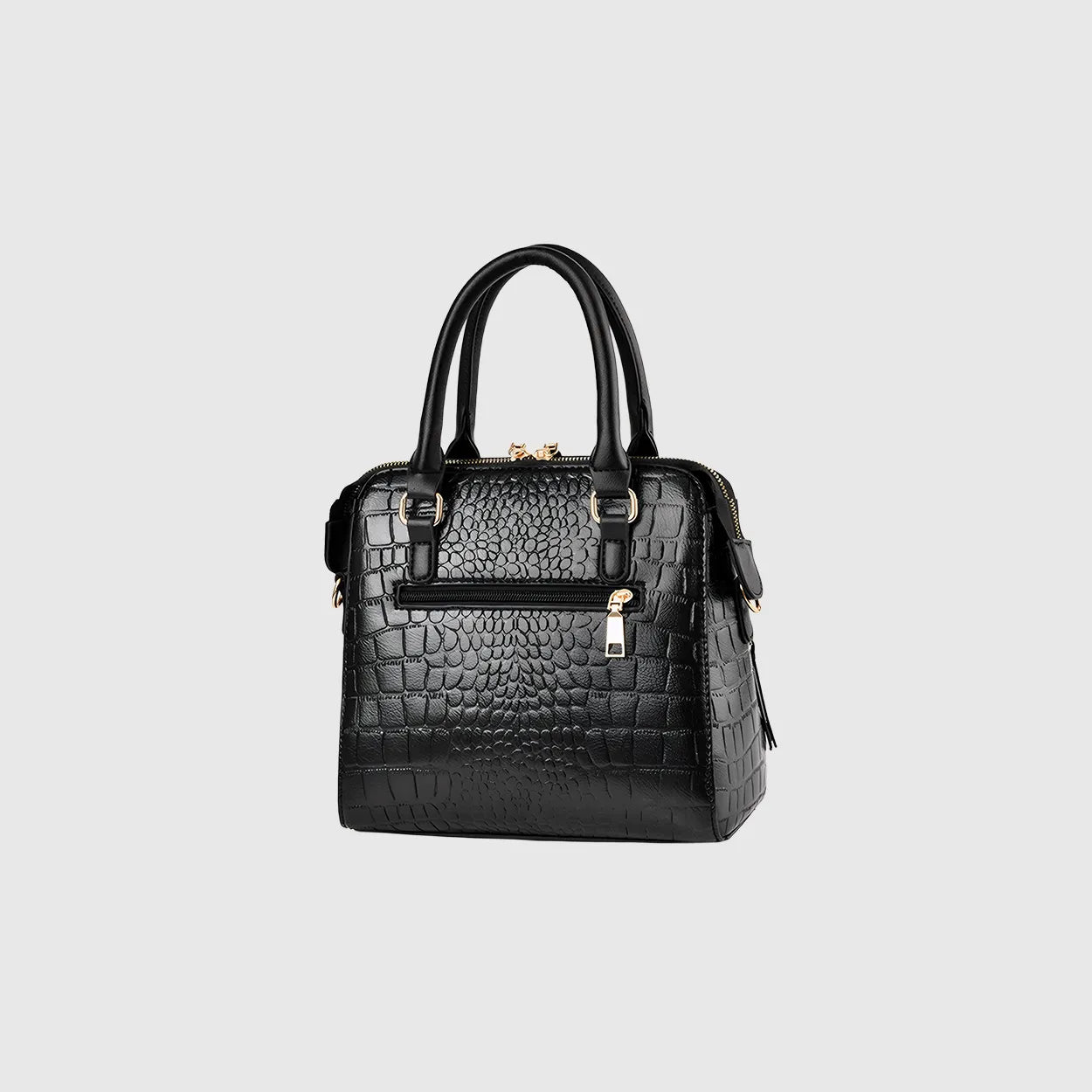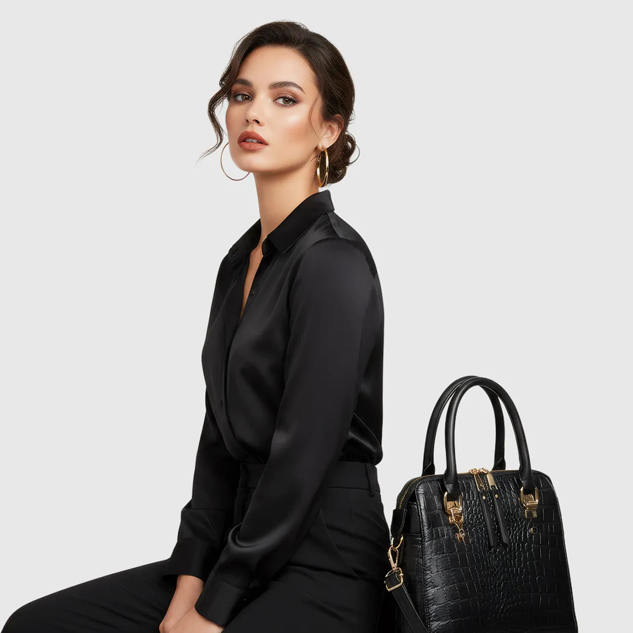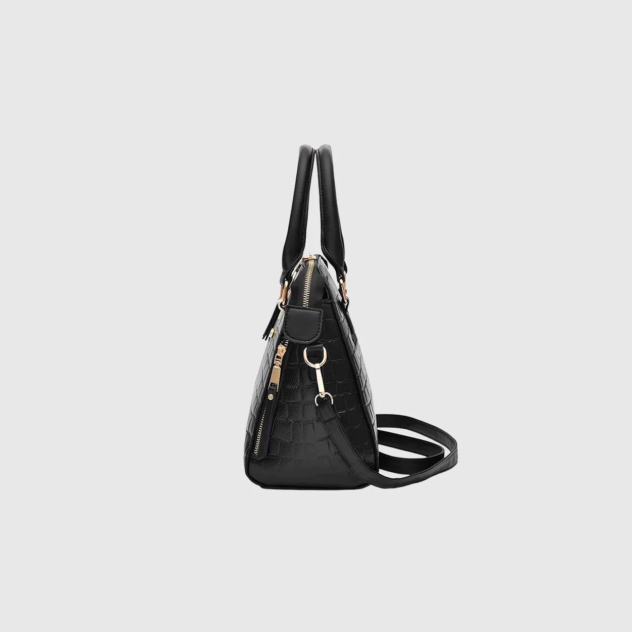 Confidence with a croc allure. This glossy PU leather handbag shimmers with poise, pairing timeless elegance with modern everyday charm.