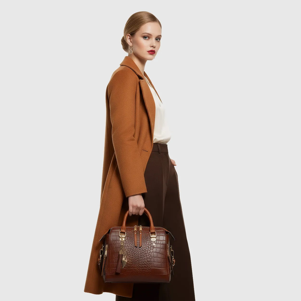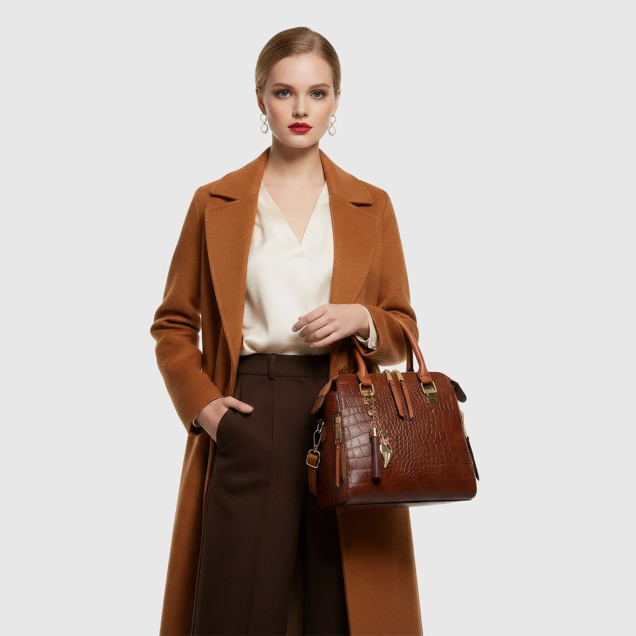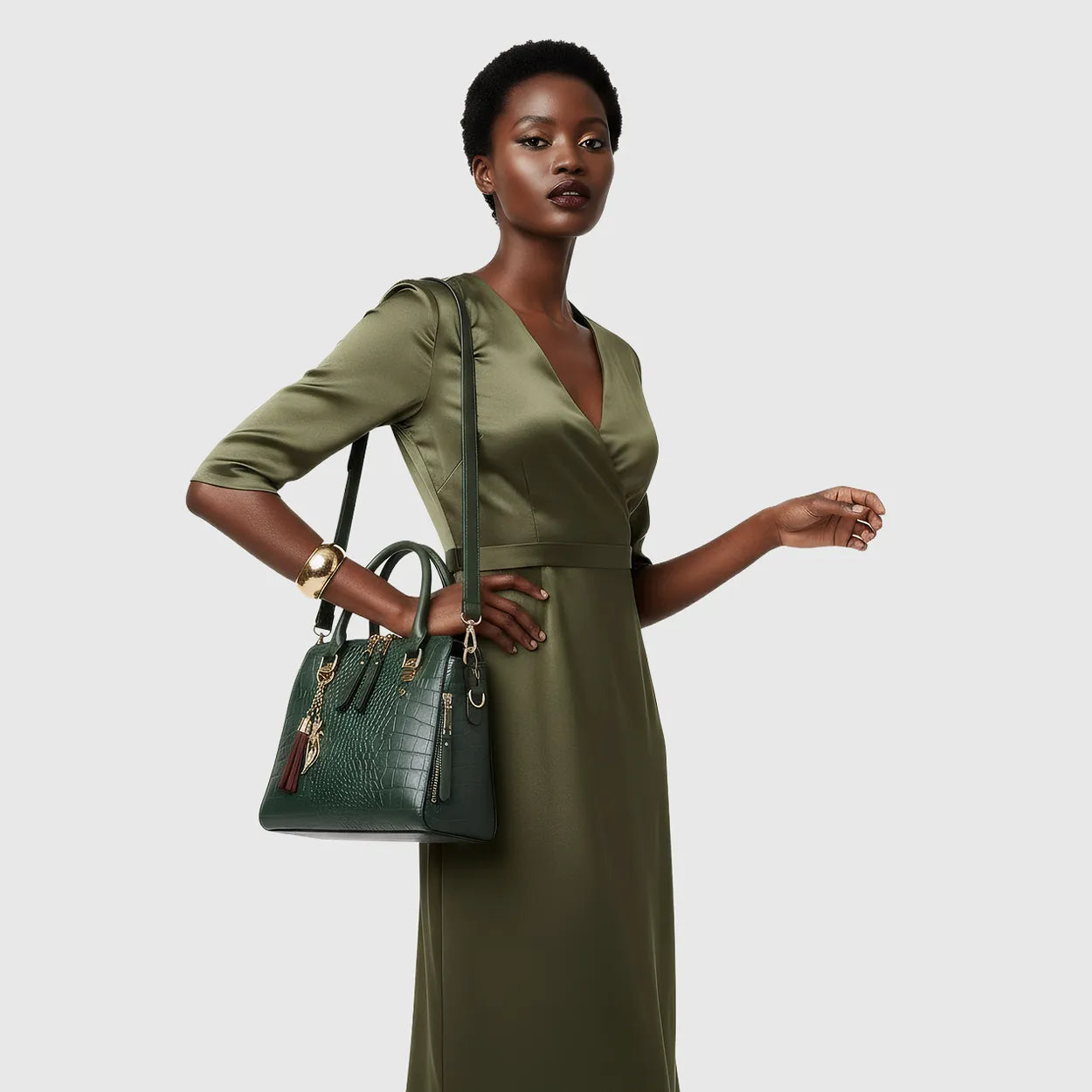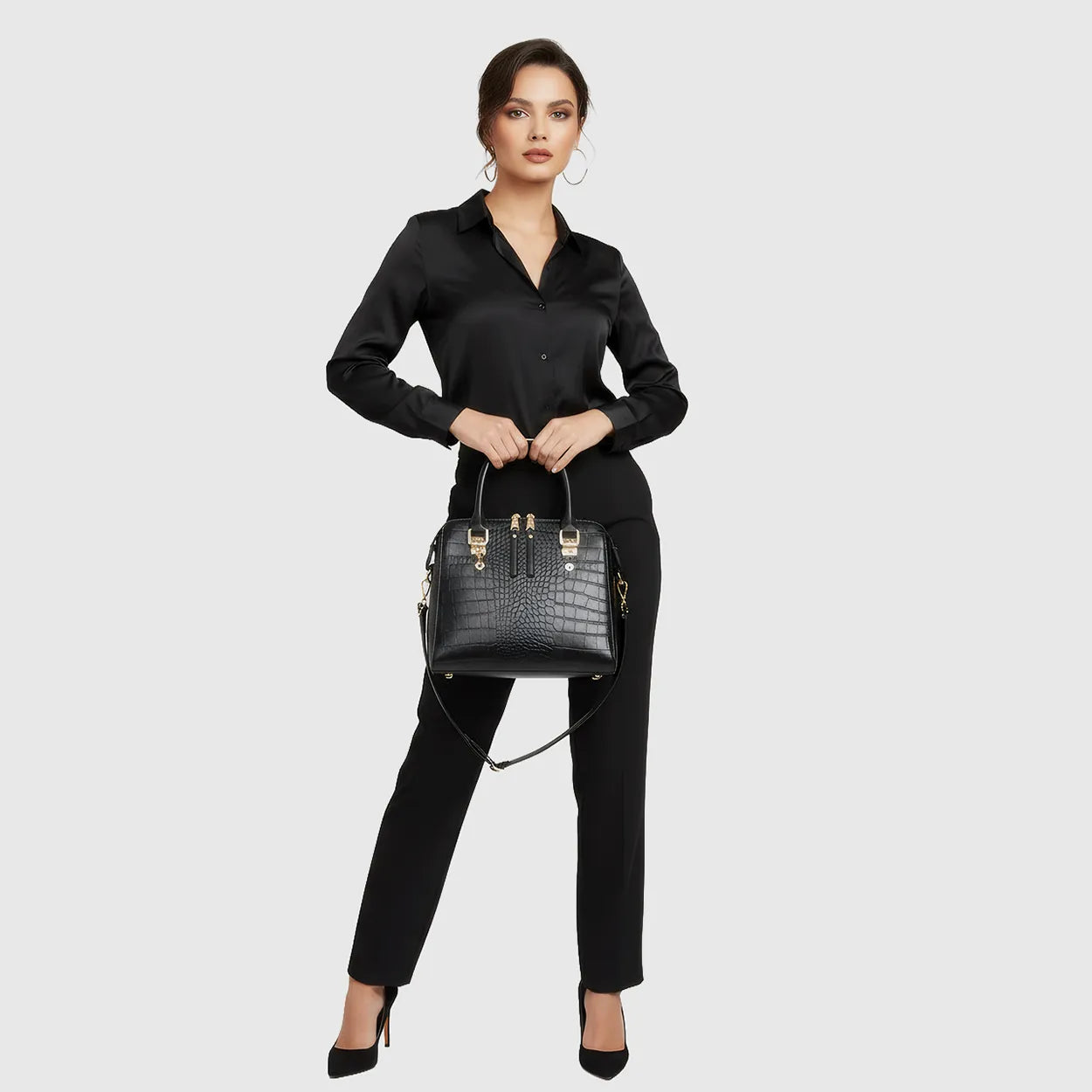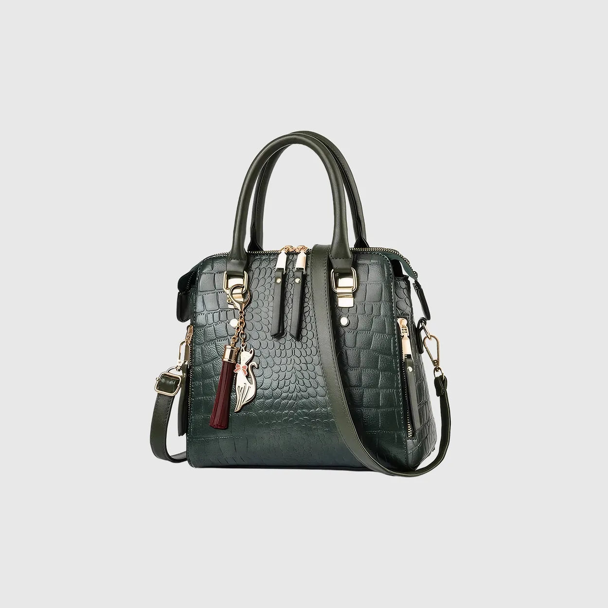 Confidence with a croc allure. This glossy PU leather handbag shimmers with poise, pairing timeless elegance with modern everyday charm.