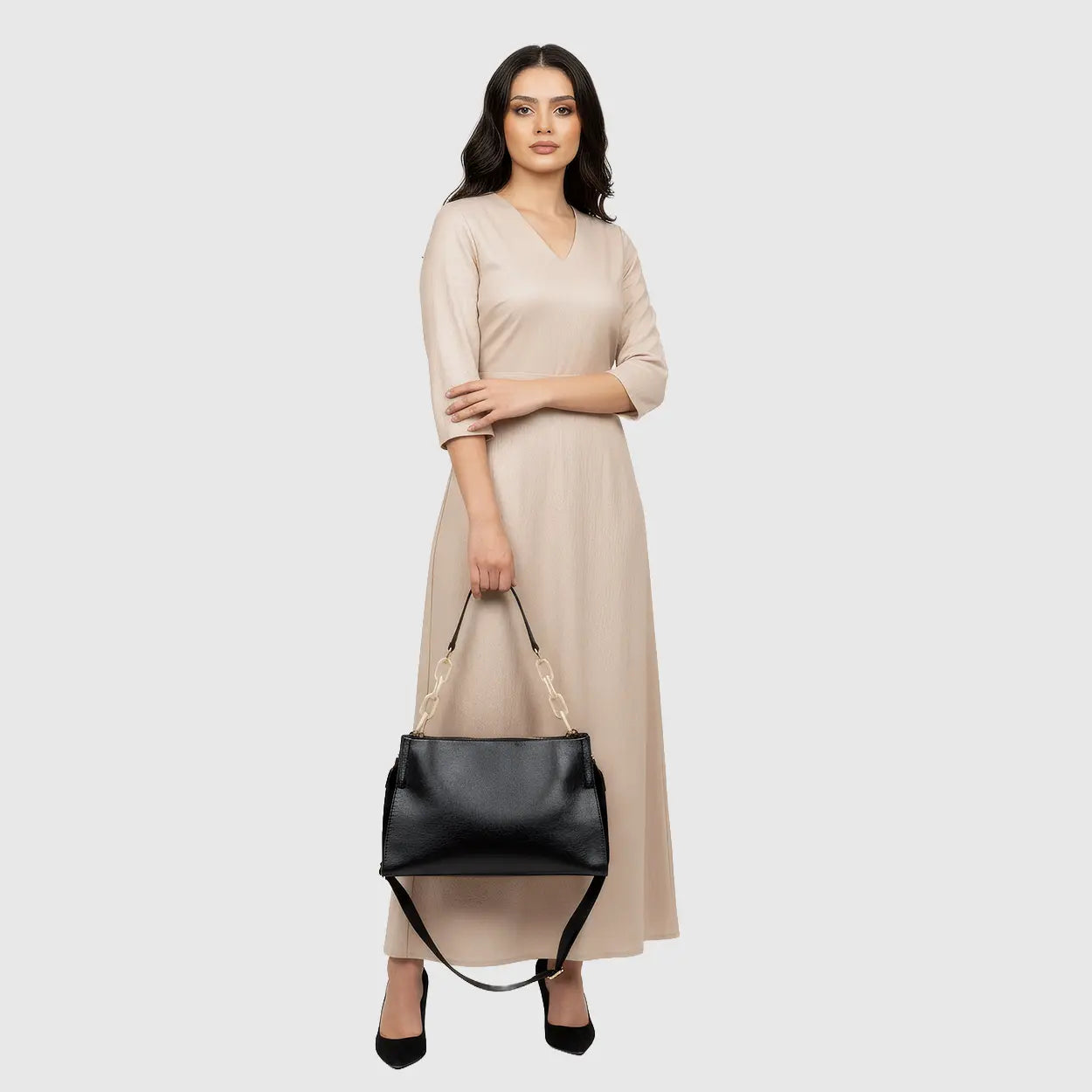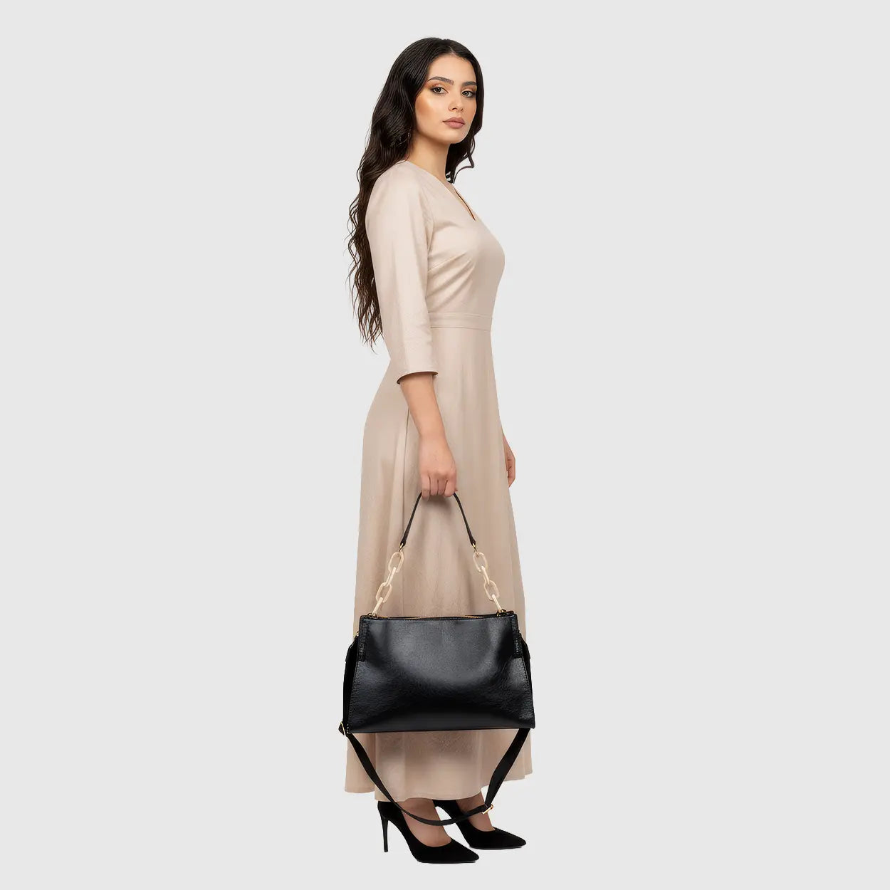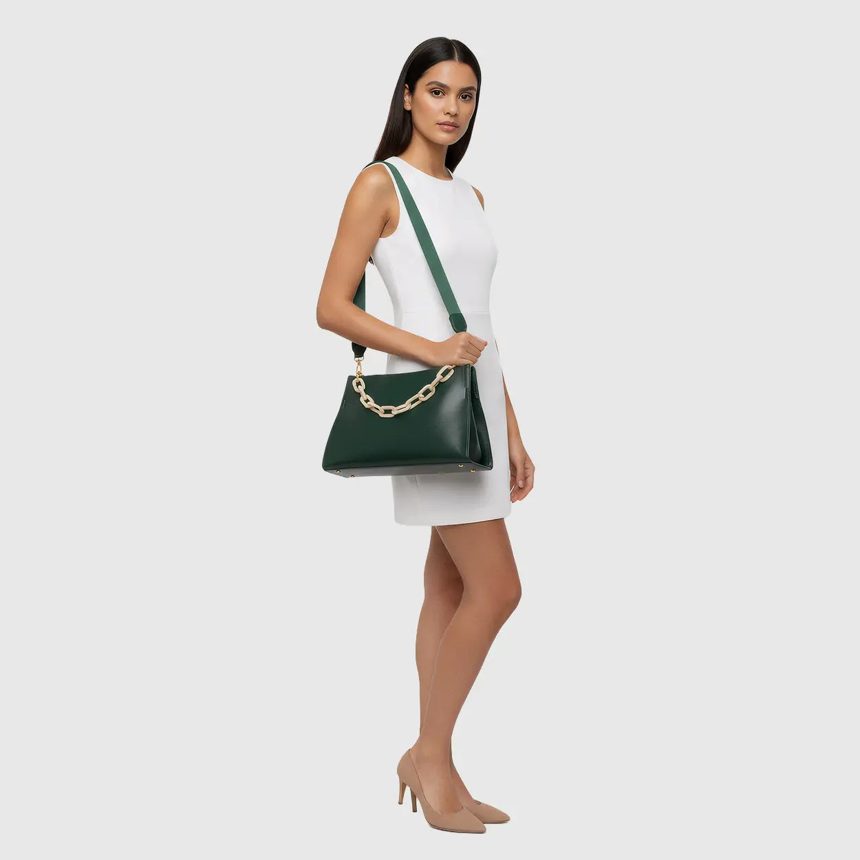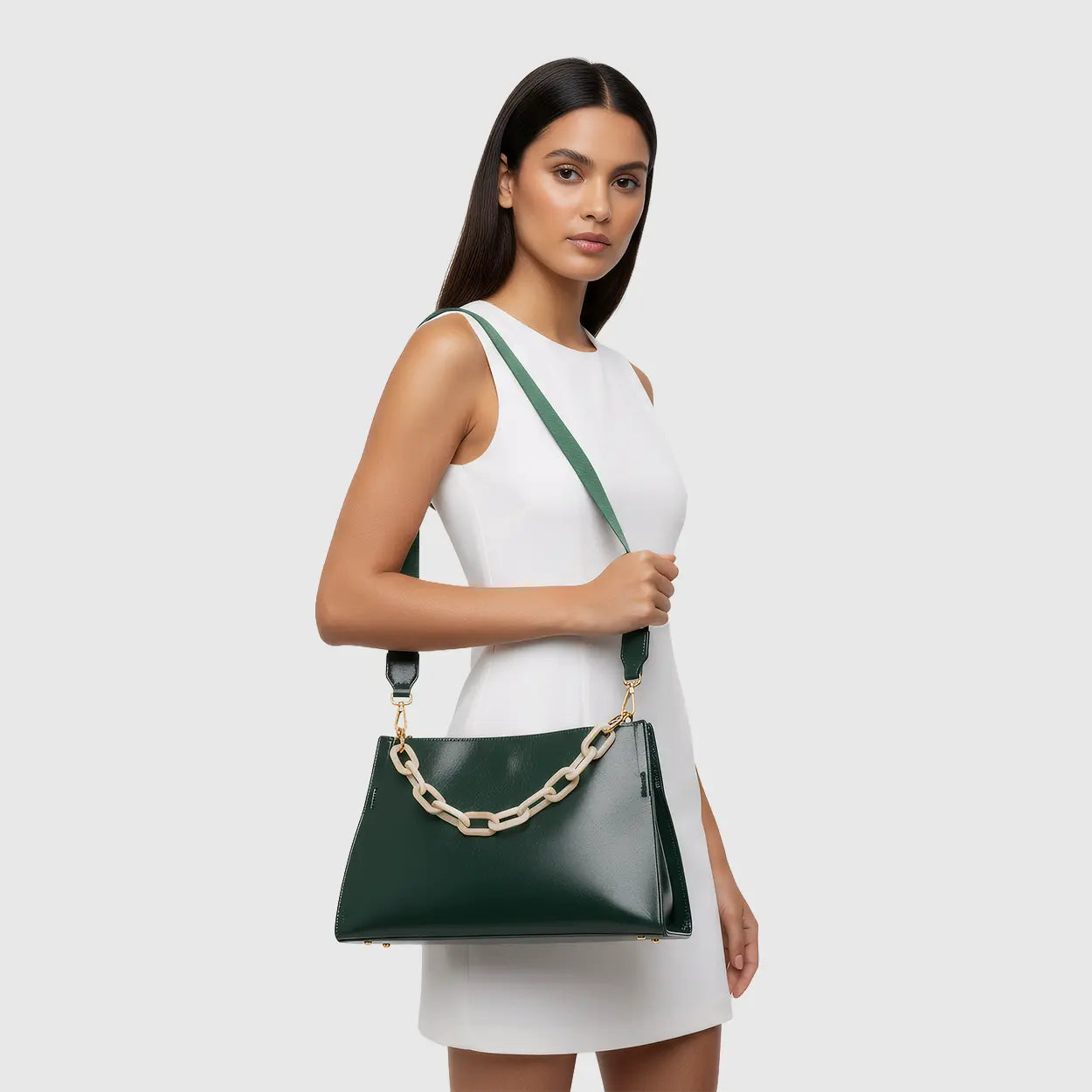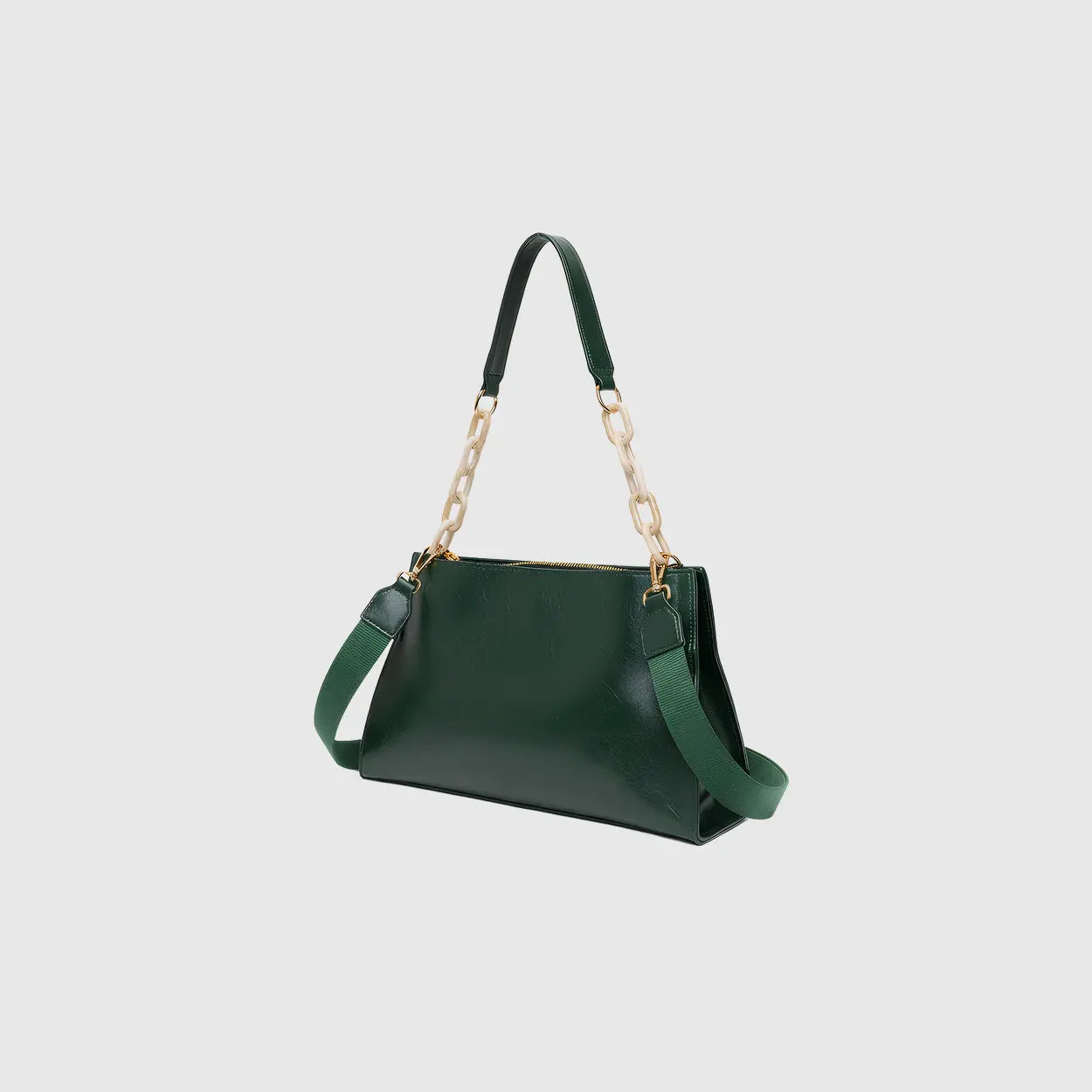 Modern minimalism with a glossy edge. This soft PU leather bag with acrylic chain handles adds effortless polish to every look, day or night.