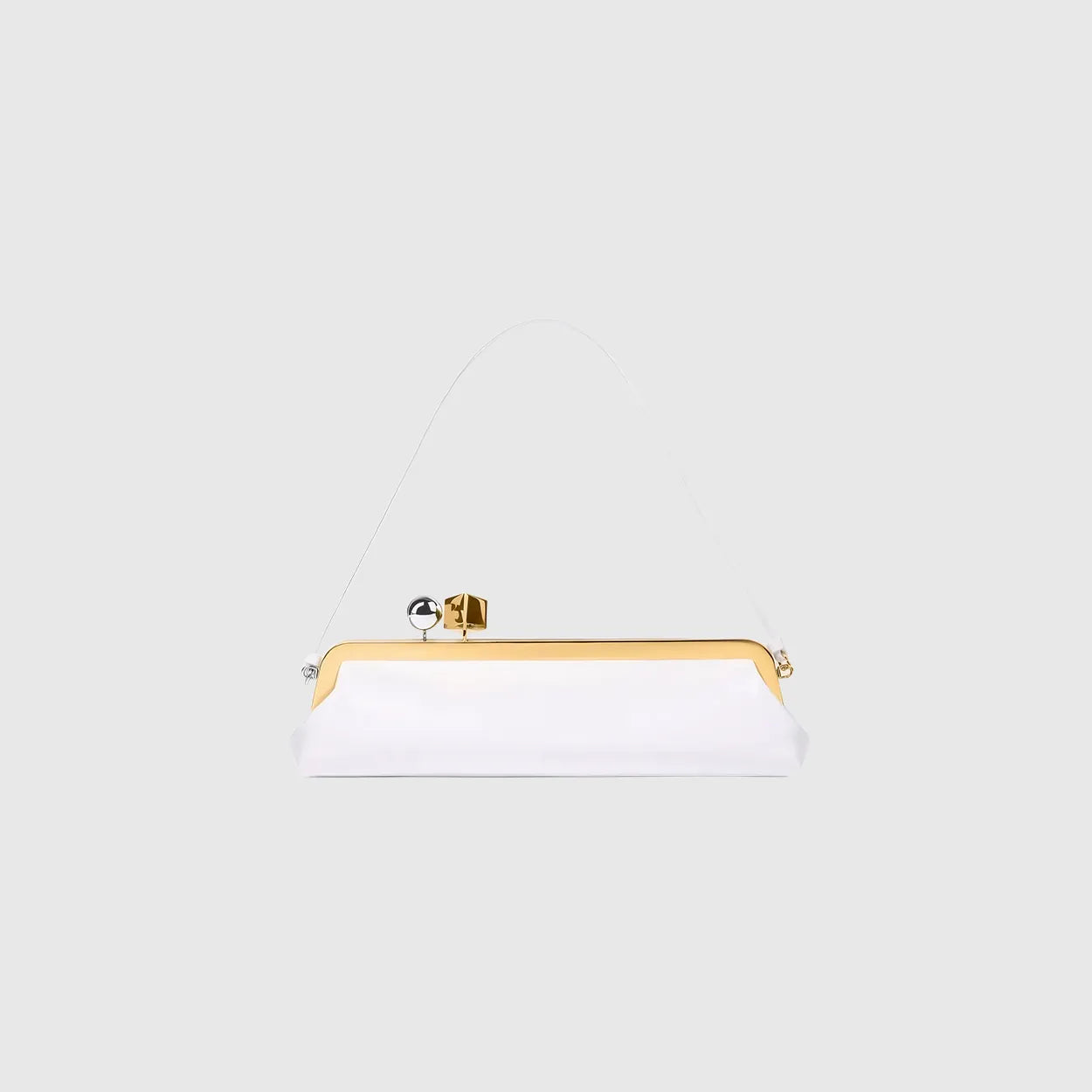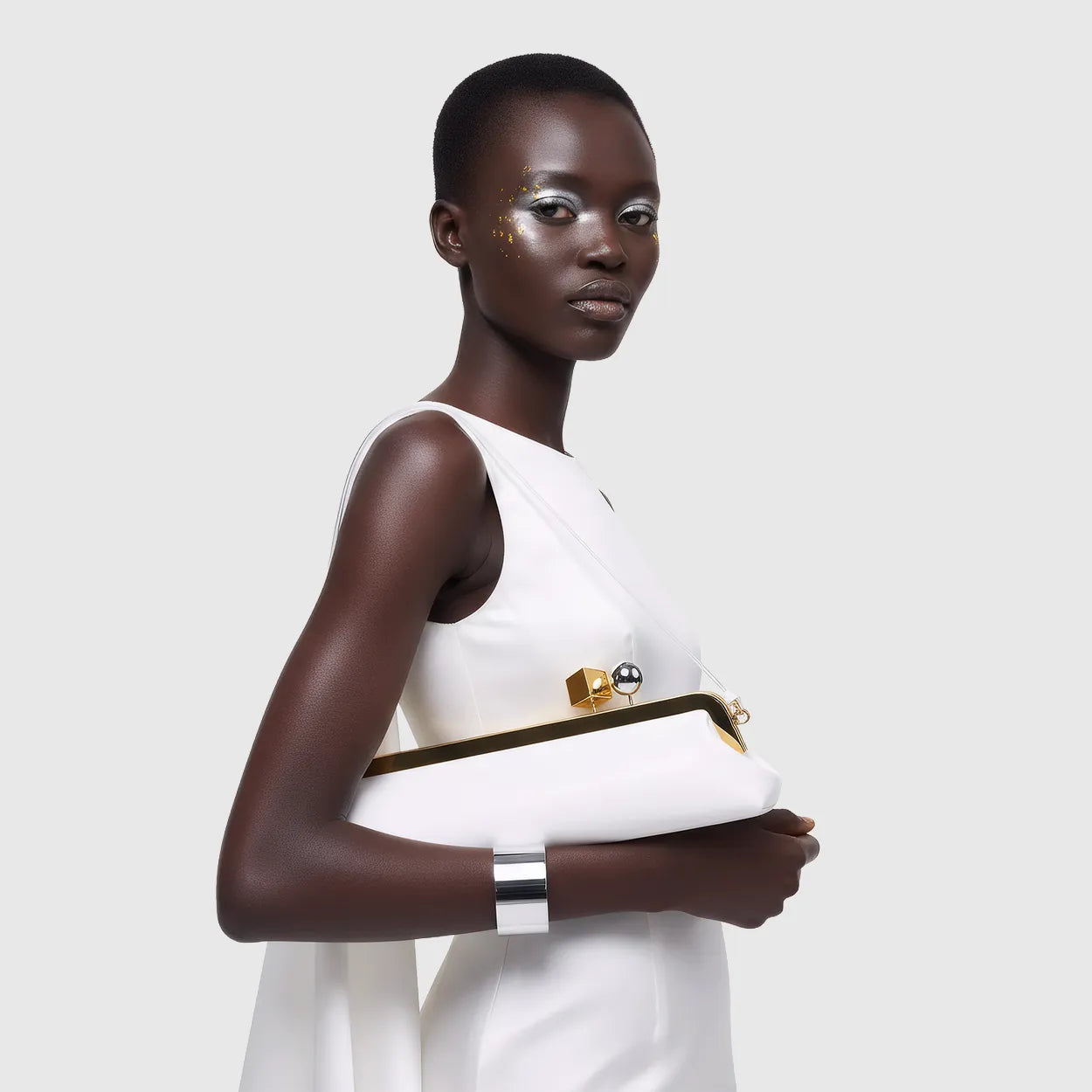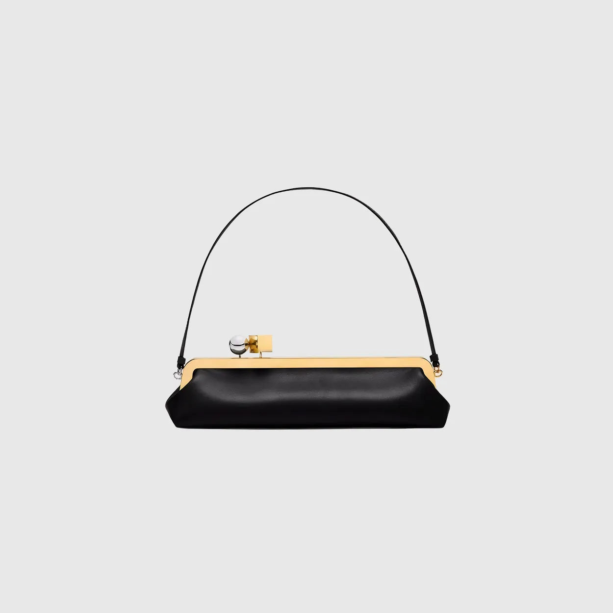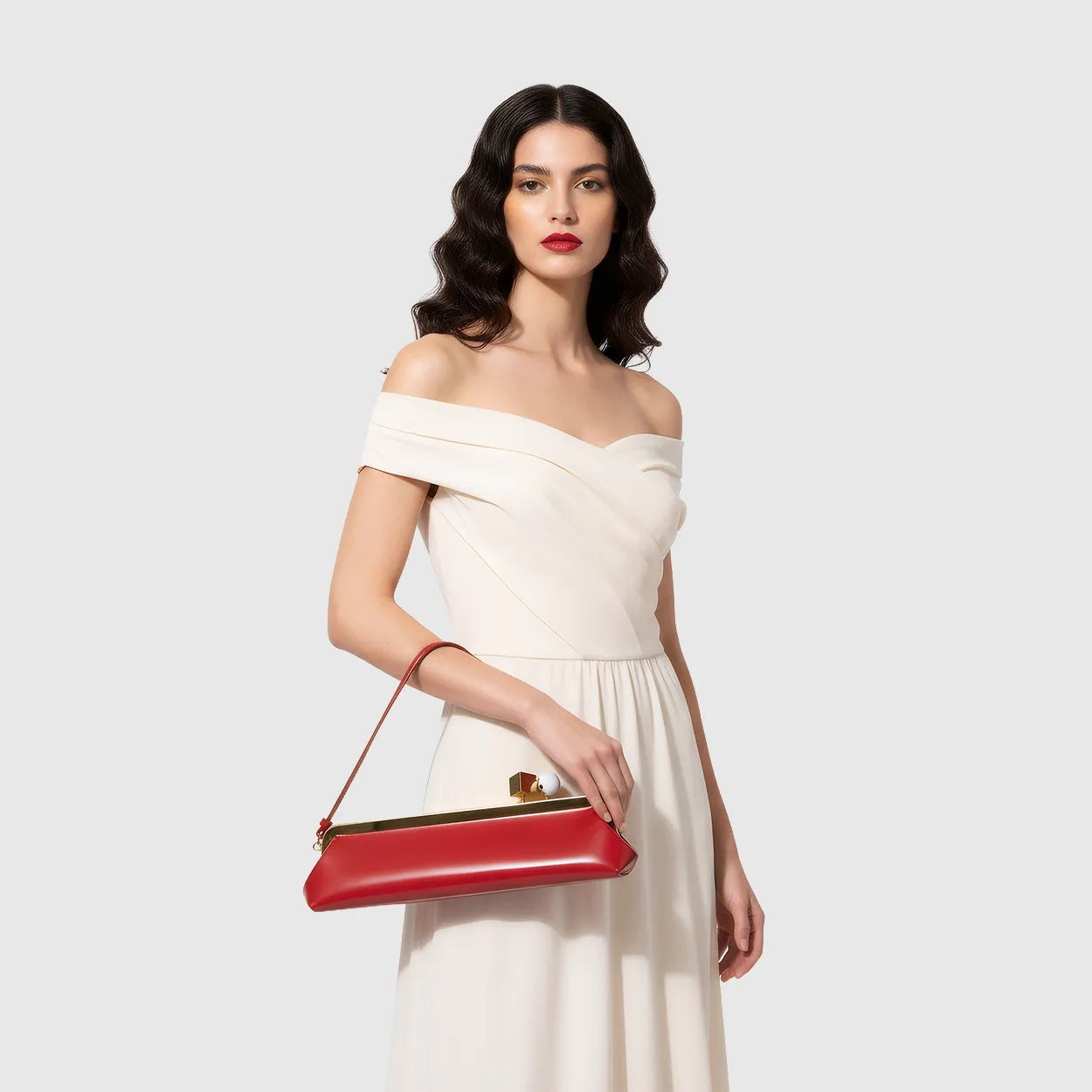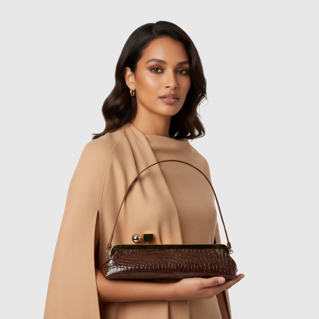 Elegance refined. This sleek PU leather baguette with metallic clasp and frame moves effortlessly from polished soirées to modern everyday grace.