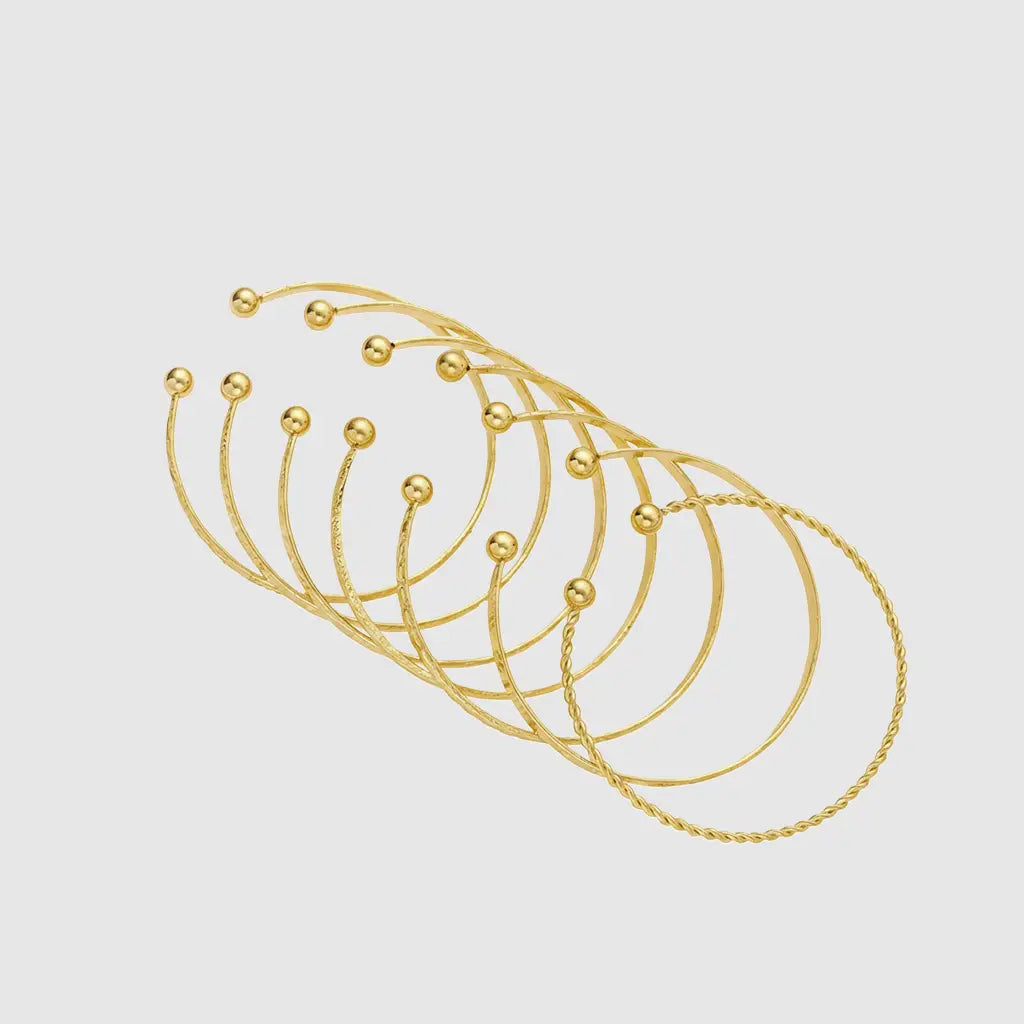 Avalaor foi feito para sobreposição – sete pulseiras douradas, cada uma com a sua própria textura, unidas num conjunto marcante. Desde detalhes em corda torcida a gravações geométricas, esta coleção transforma o seu pulso numa tela de punk chique e glamour boémio. Use-as todas juntas para um impacto maior, ou combine-as para uma liberdade de estilo sem fim.